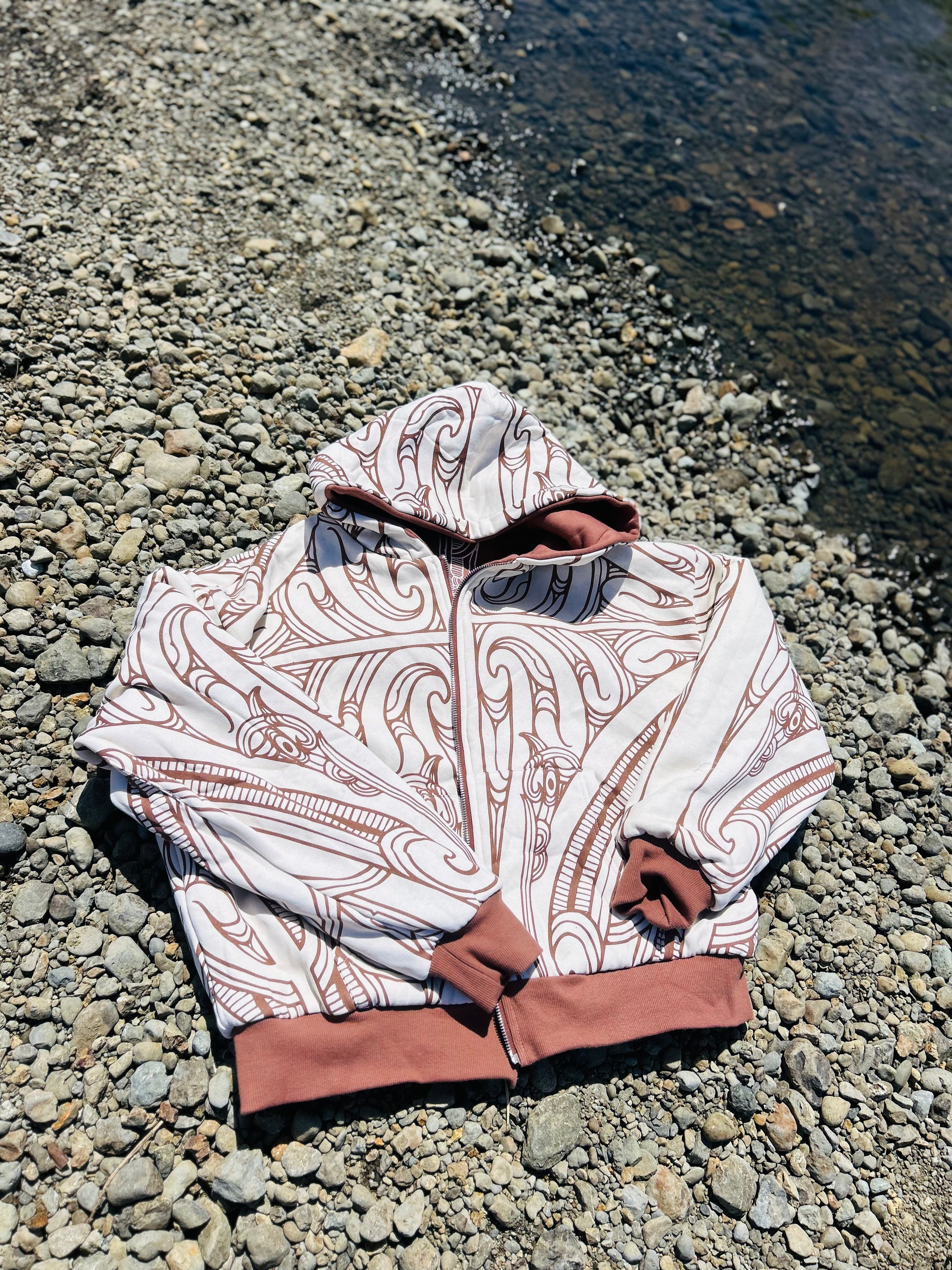Our kakahu carries the breath of whakapapa in every line. The front patterns honour Te Taiao and the swiftness of Puoro, while the Manaia stands as the backbone of those who walked before us a quiet reminder of gratitude, guidance, and protection. Woven throughout are symbols of the sacred bond between māmā and pēpi, the whenua they share, and the manaaki that nourishes us back to our roots. Water flows through the design, showing that connection remains, no matter the distance. On the back, the Manaia rises again, linking Te Ao and Te Pō, past and present, with haehae lines marking the generations we carry. This kākahu is strength a gentle call to stand true in who you are, and where you come from.